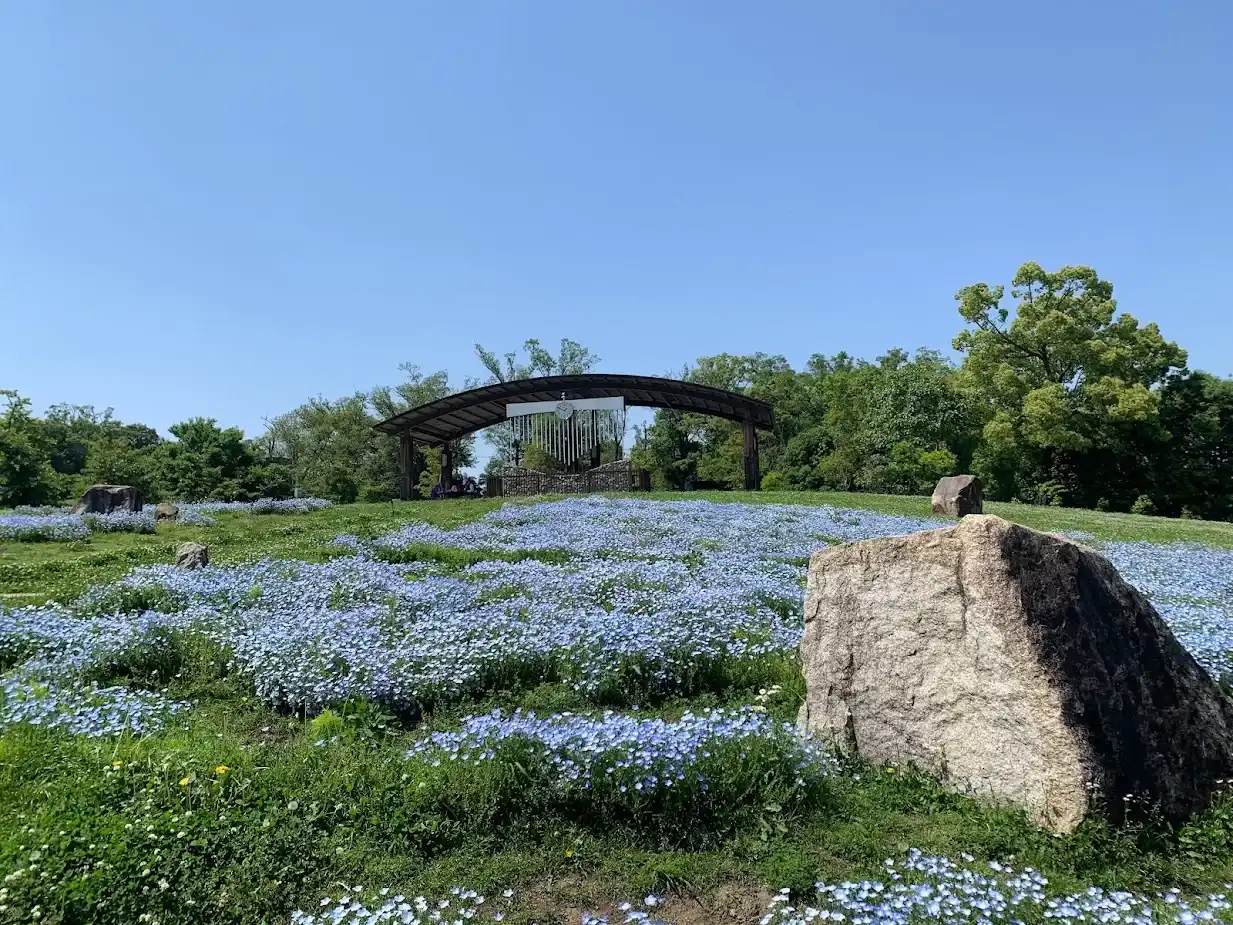 สวนสาธารณะขนาดใหญ่ในนาราที่มีภูมิทัศน์เนินเขาเปิดโล่ง บริเวณ “Tsudoi no Oka” จะถูกปกคลุมด้วยเนโมฟีลาสีฟ้าสดใสในช่วงปลายฤดูใบไม้ผลิ ความกว้างของพื้นที่ทำให้มองเห็นทุ่งดอกไม้แบบพาโนรามา และยังมีดอกไม้ฤดูใบไม้ผลิชนิดอื่นบานต่อเนื่อง