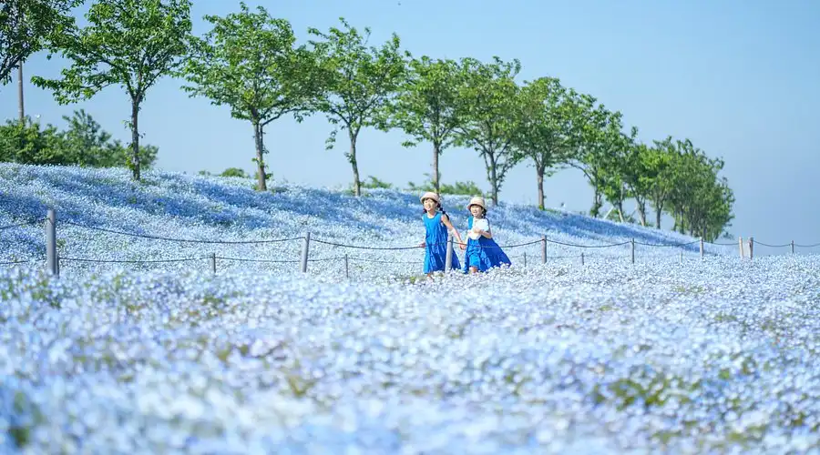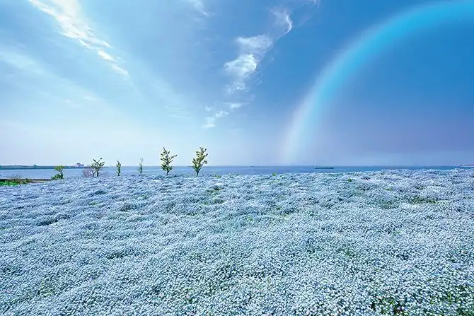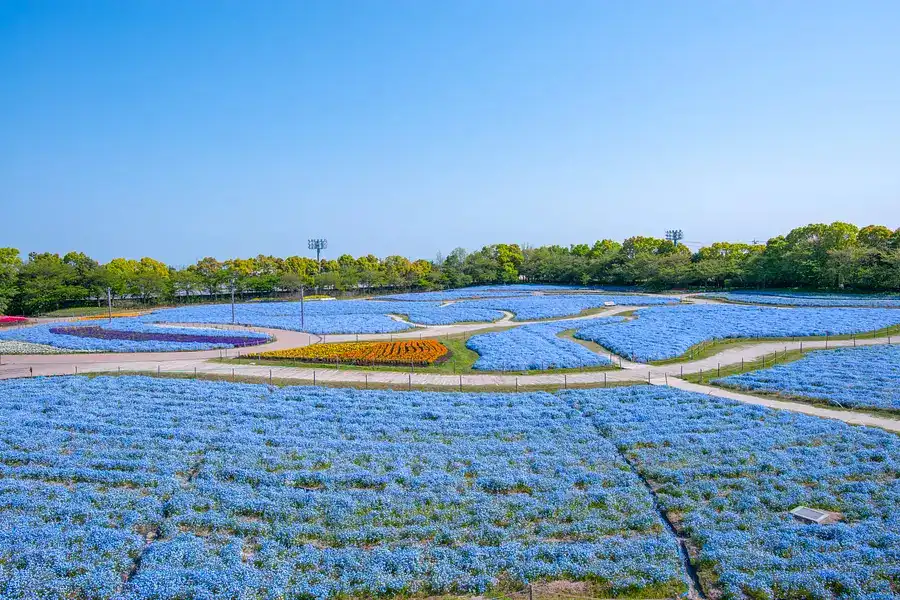 ทุ่งเนโมฟีลาริมอ่าวโอซาก้าที่ขึ้นชื่อเรื่องวิว “Infinity” เพราะสีฟ้าของดอกไม้เชื่อมต่อกับทะเลและท้องฟ้าอย่างไร้รอยต่อ บนพื้นที่กว่า 4 เฮกตาร์ ปลูกเนโมฟีลาประมาณ 1 ล้านต้น ช่วงเทศกาลจะมีโซนถ่ายภาพ มุมชมวิว และกิจกรรมพิเศษ ทำให้บรรยากาศมีชีวิตชีวา