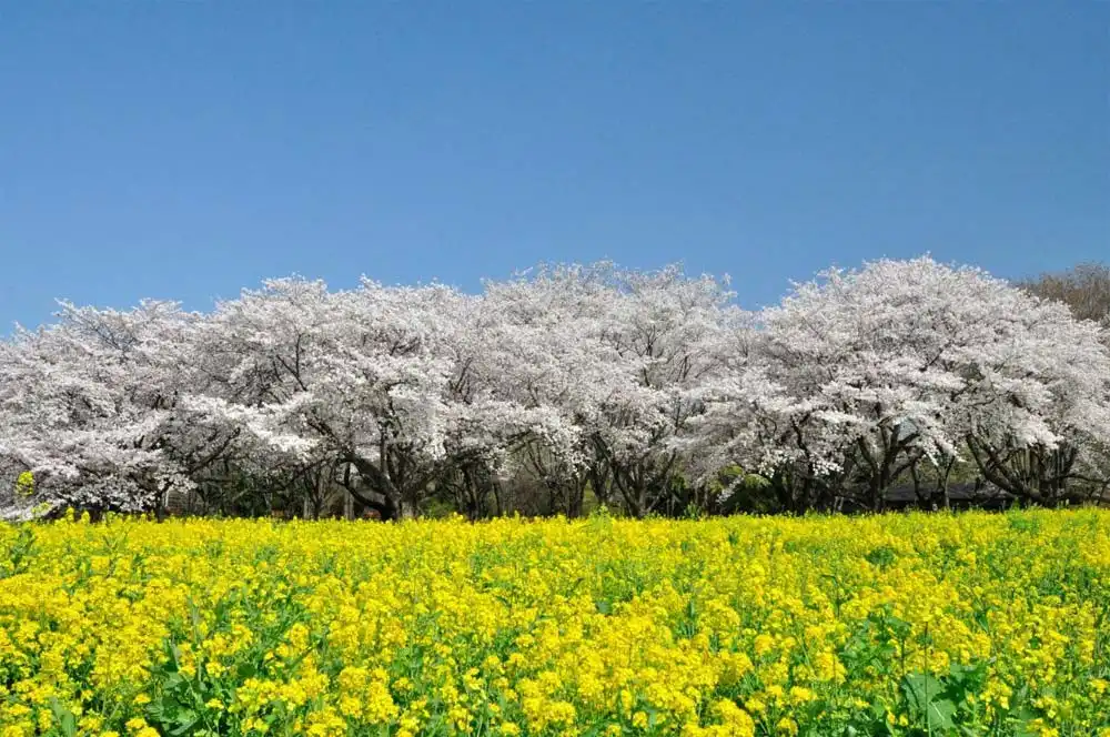 ต้น พร้อมทุ่งดอกนาโนะฮานะสีเหลืองสดตัดกับสีชมพูของซากุระ