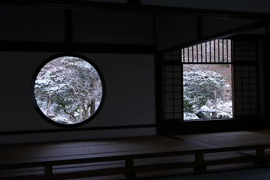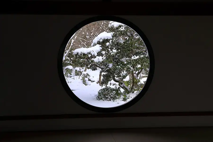 วัดเก็นโกอัน สถานที่ที่มีเสน่ห์แบบเงียบ ๆ ผ่านหน้าต่างสองบานที่เปิดมุมมองสู่สวนหิมะอย่างพอดี มองออกไปแล้วเหมือนภาพที่ถูกจัดวางอย่างตั้งใจ เป็นช่วงเวลาที่ทำให้หลายคนประทับใจในความสวยงามที่เรียบง่ายแต่กินใจ