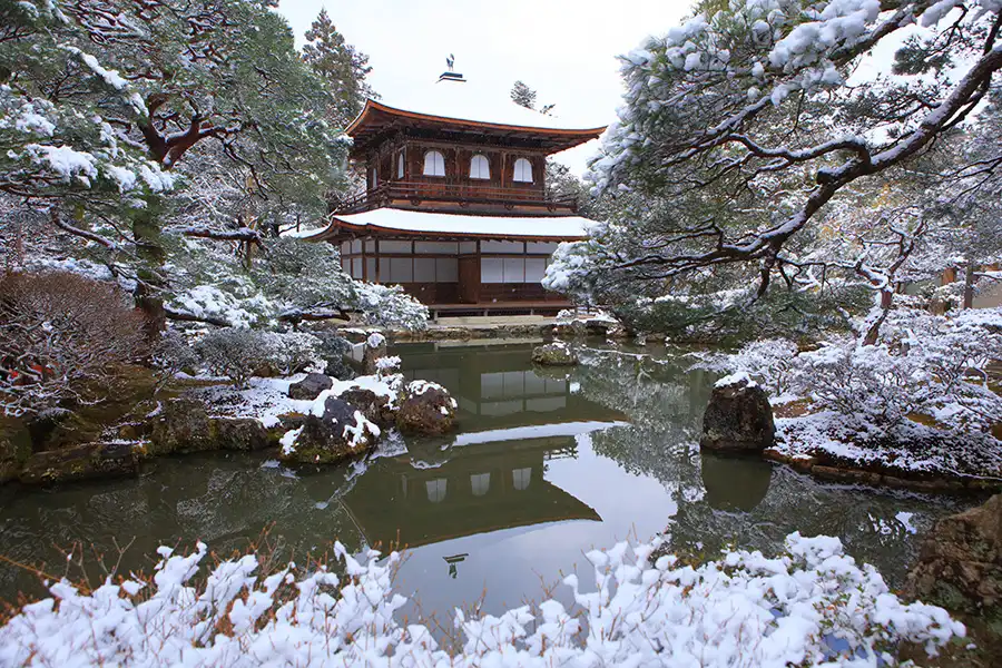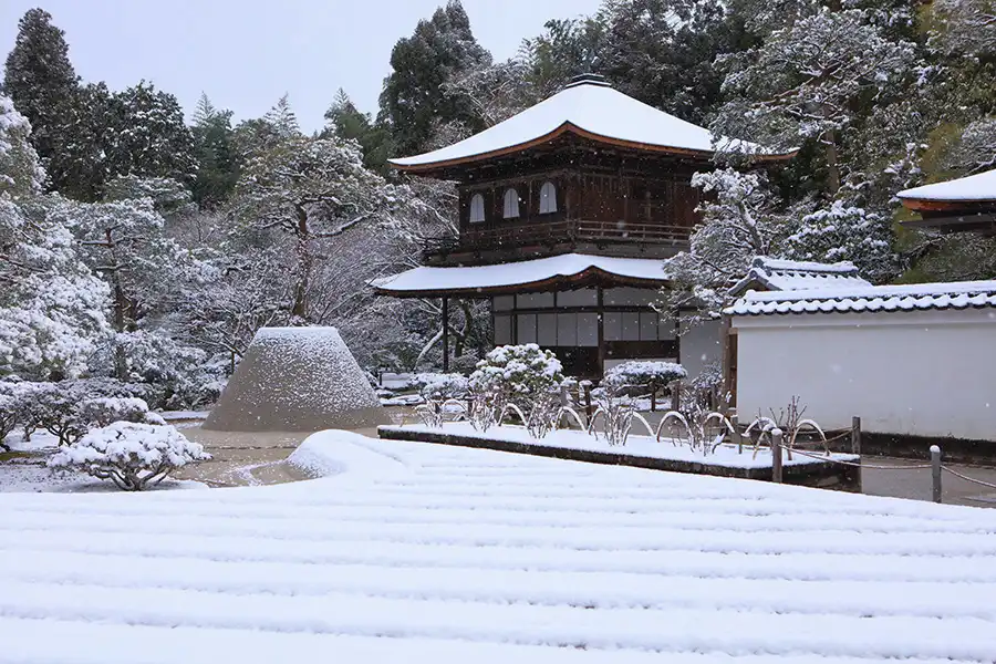 วัดกิงคะคุจิ (ศาลาสีเงิน) หากหิมะเพิ่งหยุดและท้องฟ้าเริ่มเปิด จะได้เห็นภาพสวนญี่ปุ่นที่มีทั้งสีขาวของหิมะและสีฟ้าของท้องฟ้าในมุมเดียวกัน บรรยากาศแบบนี้จะเกิดขึ้นเพียงไม่กี่ชั่วโมงในหนึ่งวัน และเป็นเหตุผลที่ทำให้ใครหลายคนอยากกลับมาเกียวโตช่วงหน้าหนาวอีกครั้งเลยทีเดียวค่ะ