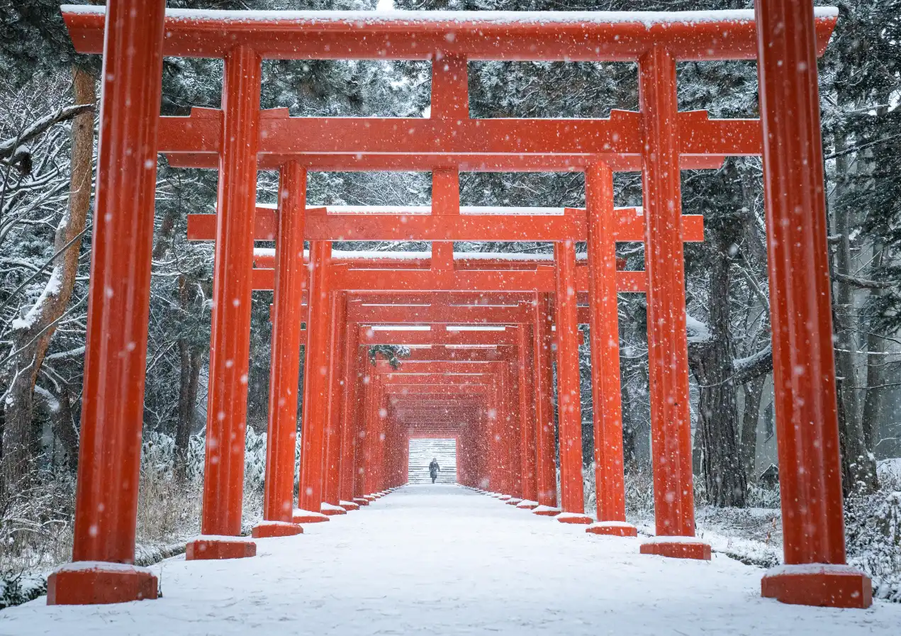 บรรยากาศยามเช้าของศาลเจ้าแห่งนี้ท่ามกลางหิมะทำให้เสาโทริอิสีแดงเด่นขึ้นเป็นพิเศษ เส้นทางทอดยาวเงียบสงบจนอดคิดไม่ได้ว่า หากใครได้มาเดินตอนนี้คงรู้สึกเหมือนมีทางเดินส่วนตัวของตัวเองจริง ๆ