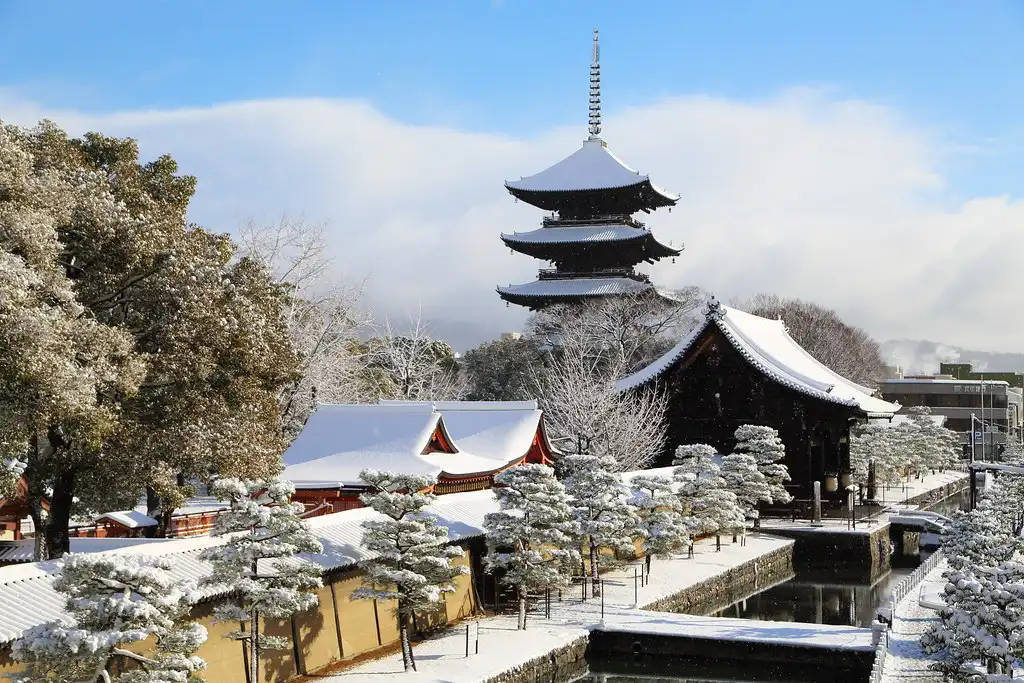 วัดโทจิ เจดีย์ห้าชั้นสูงเด่นกลางลานว่างที่มีหิมะเกาะเป็นหย่อม ๆ ให้บรรยากาศนิ่ง สบายตา และชวนให้หยิบกล้องขึ้นมาถ่ายภาพความประทับใจ