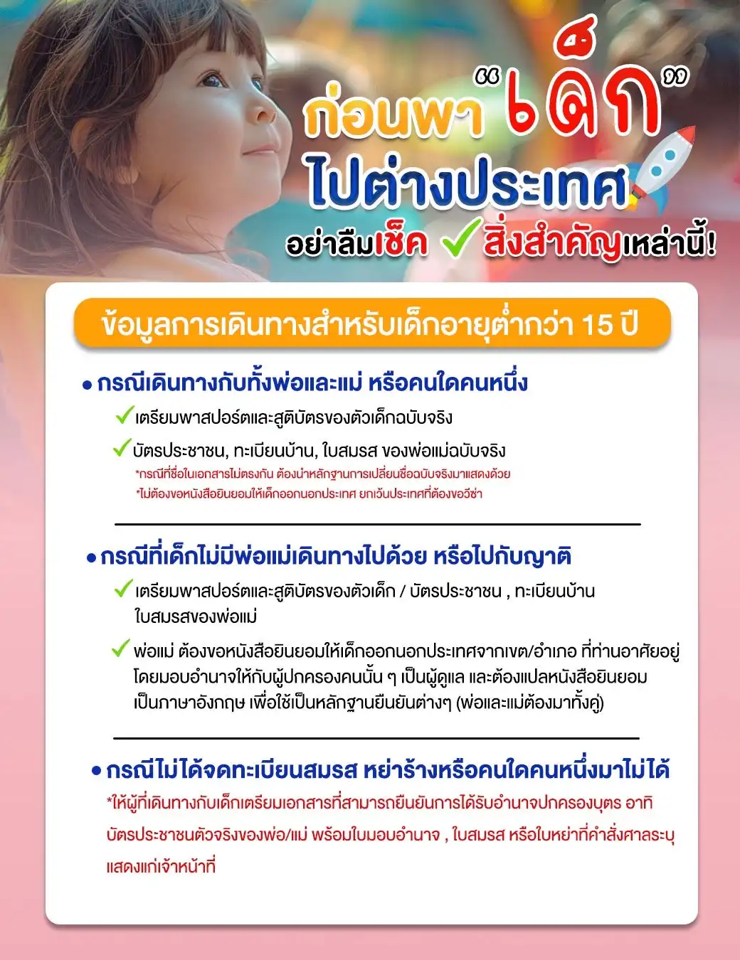 ก่อนพา "เด็ก" ไปต่างประเทศ อย่าลืมเช็คสิ่งสำคัญเหล่านี้!!  ข้อมูลการเดินทางสำหรับเด็กอายุต่ำกว่า 15 ปี ผู้ปกครองควรเตรียมพร้อมก่อนการเดินทาง